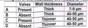 NUMS MDCAT 2024 PAPER NUMS 2024 ( PART 3 ) 1. Enzyme catalase protects the plant cell from: Toxic effect of alcohol metabolism Dehydration Protein loss Photorespiration 2. Which of the following set of characteristics are related to veins C B D A 3. Which of the following would not be compromised in the absence of lymphatic system Blood composition Defense mechanism Oxygen carrying capacity of blood Blood pressure 4. The presence of which molecules distinguishes blood from interstitial fluid RBCs and large proteins Large proteins and electrolytes Antibodies and electrolytes Glucose and RBCs 5. Plants growing in saline soil face the problem of dehydration due to: B A C D 6. During Covid-19 epidemic, the plasma of recovered patients was Injected in covid patients. This proved quite effective. Which component of plasma do you think was responsible for this: Plasminogen Interferons Antibodies Intertlukin-1 7. Choose the one which is example of artificial active Immunity: Mother receiving antibodies Fetus receiving antibodies of mother through placenta Prevention of a decease due to previous infection Baby receiving MMR shots 8. Which of the following type of T cells are required for the activation of B cells Memory T cells Cytotoxic T cells Suppresser T cells Helper T cells 9. What is the fate of a neurotransmitter after the transmission of nerve Impulse across synapse Broken down by enzymes Remains stray in the synaptic deft Remains behind to post synaptic membrane It is taken kilo post synaptic neuron 10. Which immediate change is brought about in the post synaptic membrane on binding with excitatory neurotransmitter Sodium gates open Sodium potassium pump ceases to work Sodium gates close Calcium gates open Loading … Pages: 1 2 3 4 5 6 7 8 9 10 11 12